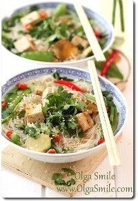 Zupa chińska z tofu, makaronem ryżowym, groszkiem i sezamem