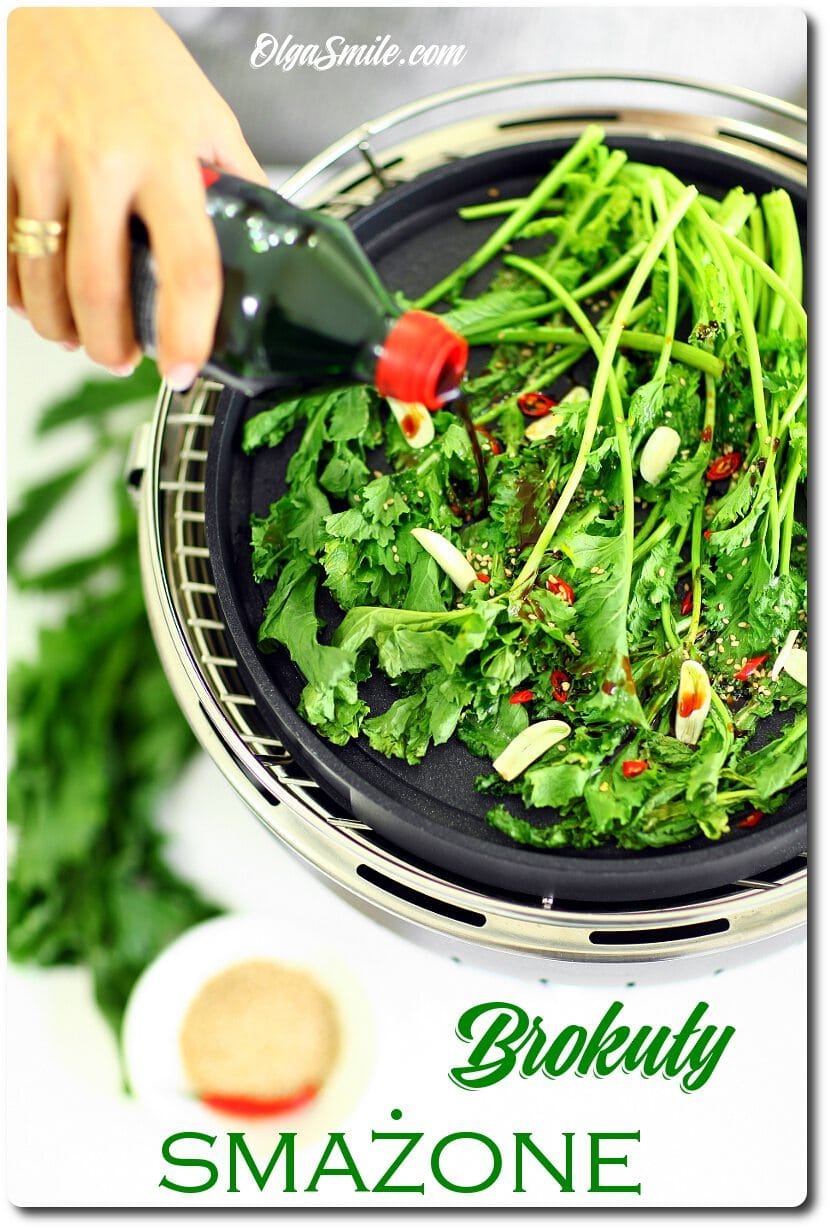 Kilka razy pokazywałam już brokuły smażone. Jednak doszłam do wniosku, że brokuły smażone powinny mieć podzielny przepis ze względu na smak i bogactwo możliwości jakie ze sobą niosą. Tym razem zrobiłam je z czosnkiem, chili, cebulą, sosem sojowym i solą. Można więc przyjąć, że najprościej jak się da. Jeśli macie brokuły liściaste jak moje, smaży się je na surowo. Za to brokuły klasyczne (kwiat brokuła) trzeba podgotować na patelni dodając wodę, po czym dopiero smażyć, w obu przypadkach efekt jest znakomity. Moje brokuły smażone zrobiłam na płycie gillowej, ponieważ była ona płaska, również patelnia sprawdzi się idealnie, w końcu źródło ciepła i smażenie jest takie samo. A Ty, jakie masz pomysły na brokuły, jakieś konkretne dania, lubisz to warzywo? Zapraszam, zatem brokuły smażone polecają się jako dodatek do obiadu, lub po wymieszaniu z ryżem jako pełno porcjowe danie.
