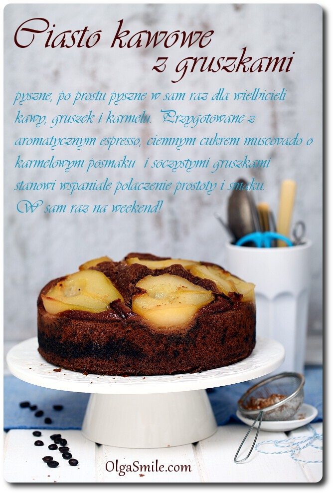 Zapraszam na ciasto kawowe z gruszkami, cukrem muscovado o zdecydowanie karmelowym posmaku i wspaniałym zapachu. Przygotowane na bazie mąki pszennej lub mieszanki bezglutenowej, z dodatkiem polenty, czyli kaszką kukurydzianą błyskawiczną pojawia się na moim stole już od jakiegoś czasu. Powstało jak większość moich ciast z potrzeby chwili, a jak wiadomo, potrzeba matka wynalazków. Pyszne, po prostu pyszne w sam raz dla wielbicieli kawy, gruszek i karmelu. W wersji dla dorosłych dajcie aromatyczne espresso oczywiście, tak, jak w przypadku wina, należy użyć dokładnie tego, które smakuje wam najbardziej. Jeśli ciasto będą jeść dzieci i nie chcecie, żeby biegały jak nakręcane króliczki, warto kawę klasyczną zamienić na wersję bezkofeinową, lub zbożową. Natomiast bezglutenowcy, ograniczający czarny napój, mogą dodać kawę z cykorii, która aż tak pięknie nie pachnie, ale chcąc nie chcąc, w smaku jest kawowa. Ostatnio najbardziej lubię ciasta, które mogę przygotować mieszając je drewnianą łyżką w dużej czerwonej misce glinianej. Tak na przekór mechanizacji, robotom i blenderom. O ile w przypadku mąki bezglutenowej ta metoda sprawdza się wyśmienicie, to mąkę pszenną lepiej będzie wymieszana jakimś elektrycznym mieszadłem no i ręce tak się nie zmęczą. Na dworze jest tak niewiarygodna obfitość życia, że aż chciałoby się chłonąc przyrodę pełną piersią albo tak przez skórę. Ptaki mają młode u nas pod dachem i uwijają się jak w ukropie. Z samego rana średniej wielkości żabki siedzą pod odpływami rynien i czekają aż będzie na nie kapała woda. Niewielki króliczek zadomowił się w moim ogródku i znalazł schronienie przed wiejskimi psami, które nocą grasują po okolicy. Od czasu do czasu w szybę kuchni uderza wielki szerszeń to znak, że mają gdzieś niedaleko gniazdo. Z bliska wygląda przerażająco, ale i wyjątkowo ciekawie. W tym roku bączki mieszkające na stałe pod donicami z lawendą są w jakimś mniejszym gronie, ale może za sprawa mieszającej również pod tą donicą ropuchy. Wszędzie, gdzie się nie spojrzy tętni życie. Pięknie, po prostu pięknie!