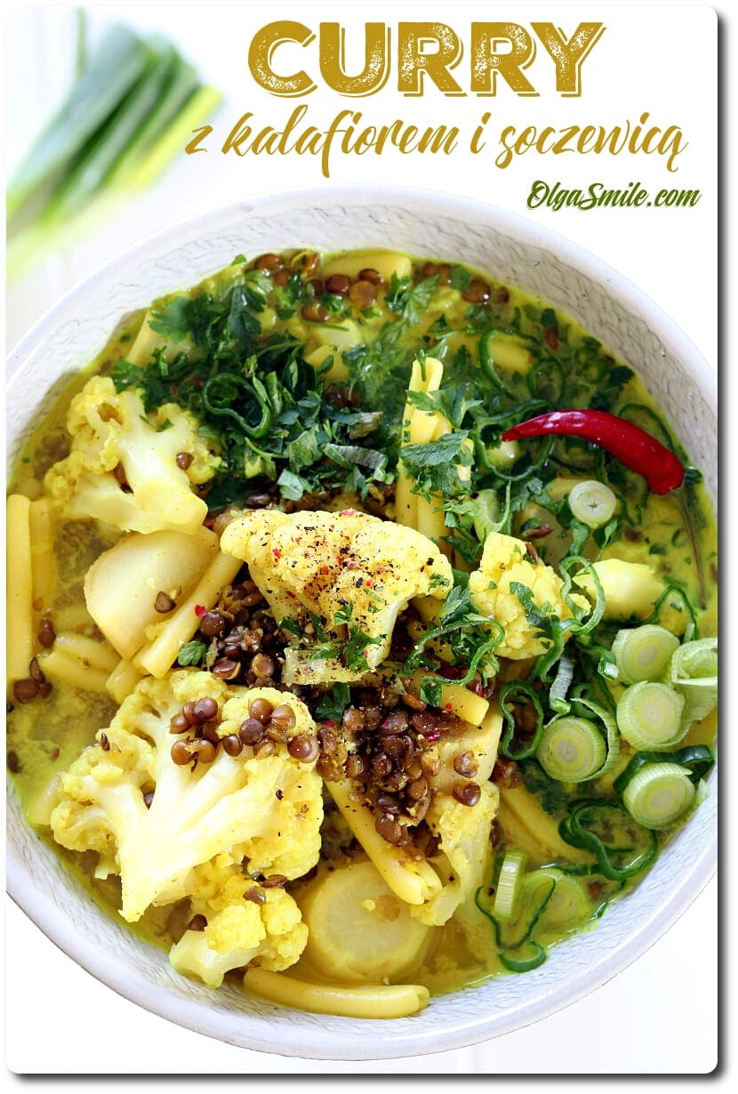 Nie mogłam się zdecydować, czy curry z kalafiorem i soczewicą jest fajniejsze, czy nowy hummus. Doszłam do wniosku, że curry z kalafiorem i soczewicą wydaje mi się ciekawszym daniem i takim bardziej dostosowanym do mojego dnia. Ponieważ miałam jeszcze w lodówce jednego kalafiora, resztkę soczewicy to doszłam do wniosku, że w taką niepewną pogodę jak ta dzisiejsza, to zupa lub gulasz warzywny będzie jednak świetnym pomysłem. Bo czemu nie? U nas w domu zupy są na porządku dziennym. Czasami powtarzamy, że dzień bez zupy jest dniem straconym! Także curry z kalafiorem i soczewicą wpasowuje się idealnie w naszą filozofię rodzinną, potrzeby ducha i smaku. Kuchnia azjatycka i generalnie bliskowschodnia czy indyjska konkretnie, ma u nas swoje szczególne miejsce. Bardzo lubię je w wersjach roślinnych właśnie za smak, ciekawe połączenia, zawsze nowe i zaskakujące przyprawy. Taka prawda, to zupełnie odmienne kuchnie od naszej polskiej czy litewskiej. A Ty, jak podajesz najczęściej kalafiora? Jakie dania z nim lubisz? Ja zapraszam z wielkim uśmiechem i przekonaniem na curry z kalafiorem i soczewicą.