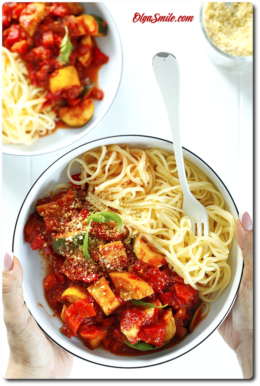 Przepis na gulasz z cukinii jest ponadczasowy, stanowi świetne pełnoporcjowe danie. Nie wiem czy wiecie, gulasz z cukinii może za każdym razem wyglądać inaczej. Wystarczy troszkę pozmieniać składniki. Poza tym, swobodnie możecie podać go z chlebem, z makaronem, kluskami, z ryżem lub kaszami. Każda z tych porcji będzie smaczna i każda zapadnie bardzo pozytywnie w pamięci. Ja jednak wybrałam makaron. Moja rodzina uwielbia kluski i makarony. Szybkie dania z makaronem są naszą specjalnością. Pomyślałam więc, czemu nie gulasz z cukinii? Każdy z członków rodziny potrafi w kilka chwil wyczarować pyszne, sezonowe danie z tego co mamy w lodówce. Taki dom, gdzie jedzenie jest często bardzo ważnym elementem codziennego życia. Gotowalnie i zdjęcia. Zdjęcia i gotowanie, jak to w blogerskiej rodzinie. Gulasz z cukinii wspaniale wpisuje się w naszą kuchnię, taką domową, ciepła, słoneczną i roślinną. Mam pytanie, jak ty przygotowujesz GULASZ? Jakie składniki do niego dodajesz? Podpowiem jeszcze, że w przypadku takich dań jednogarnkowych lub przygotowanych na patelni możecie śmiało modyfikować składniki. Gulasz z cukinii nie jedno ma imię ;) Aż chciałoby się powiedzieć! Możecie zastąpić cukinię kabaczkiem. Paprykę warzywami korzeniowymi startymi na tarce. Dodać suszone pomidory, oliwki albo kapary. Sprawdzi się też bakłażan, fenkuł, jeśli lubisz smak anyżkowy. Zmieniajcie, modyfikujcie i bawcie się składnikami a gulasz z cukinii wyjdzie za każdym razem inny! Eksperymenty w kuchni są bardzo przyjemne. To jedno z pól do realizowania swojej kreatywności, pokazywania swojego ja i bawienia się składnikami niczym malarz farbami. Zapraszam Was na gulasz z cukinii, który aż sprawia, że chce się żyć pełna parą, z energią i czekać na wiosnę!