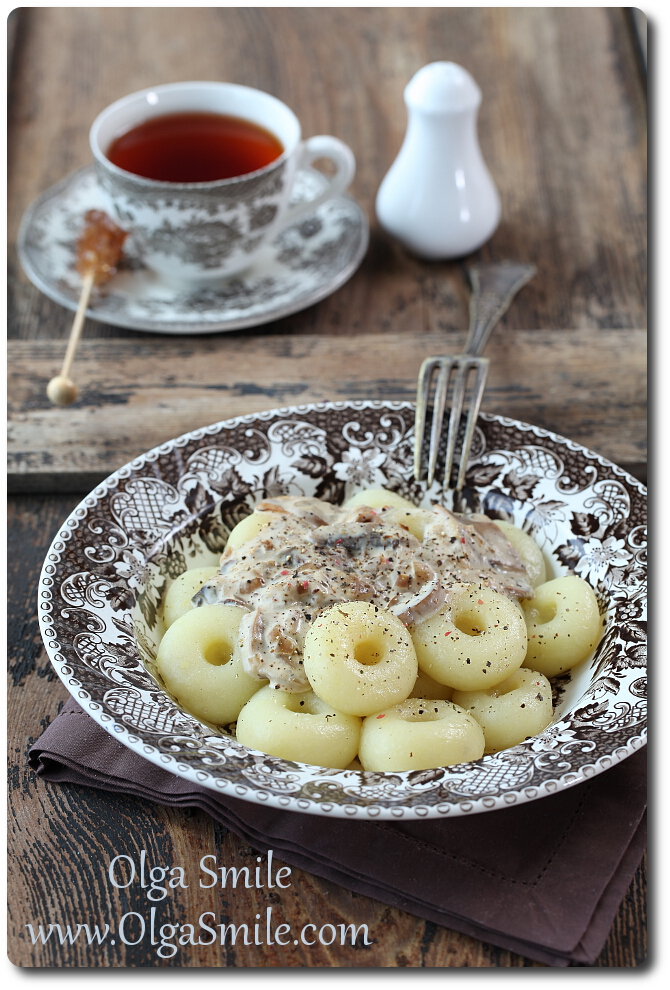 6. Ugotowane kluski polewam sosem pieczarkowym.