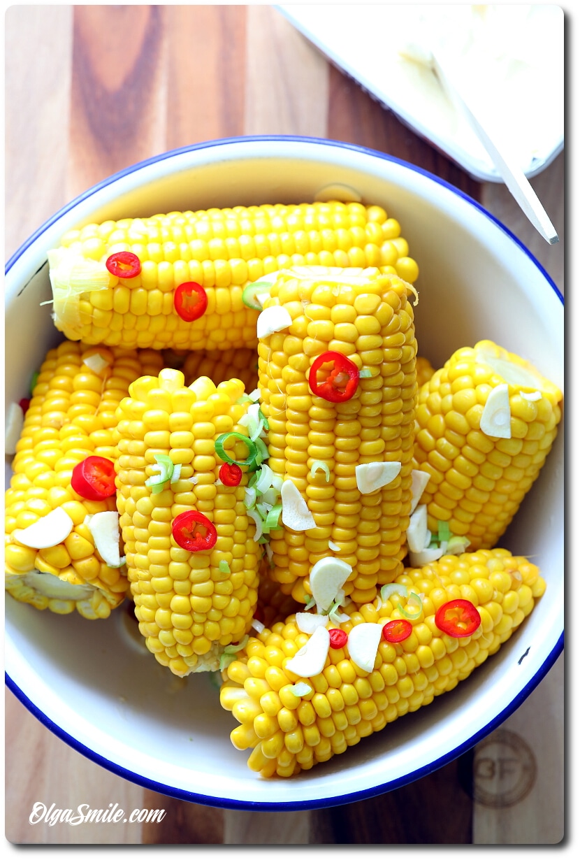 - Kukurydzę wyławiam, nacieram schłodzonym masłem lub polewam masłem z papryczką i czosnkiem.