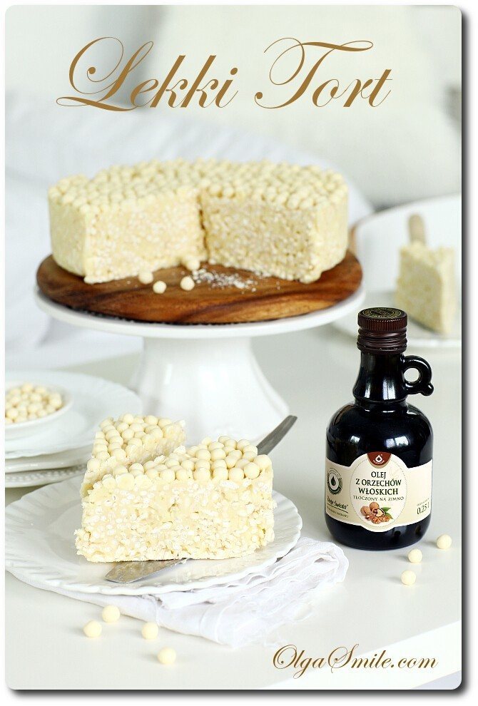 Lekki tort z białą czekoladą, ryżem preparowanym i olejem z orzechów przygotowałam pierwszy raz kilka miesięcy temu, gdy koleżanka poprosiła mnie o przyniesienie czegoś słodkiego na urodziny jej córki. Dzieciaki uwielbiają czekoladę, ale mama za nic nie chciała klasycznego, przekładanego warstwami tortu. No i dobrze! Myślę, że taki lekki tort z białą czekoladą i ryżem preparowanym jest bardzo atrakcyjny wizualnie. Smakuje równie dobrze jak wygląda i to jego wielki atut! Dla dzieci dostatecznie słodki, ale dość twardy, ale na tyle, że nie rozpada się w rączkach i nie brudzi ubrań. To fajna alternatywa dla klasycznych, nasączanych warstwowych tortów z kremem. Dodatek lekkiego jak chmurka ryżu preparowanego sprawia, że tort jest duży, okazały i ciekawy w swojej strukturze! Dokładnie tak miało być! Udało się i to bardzo!