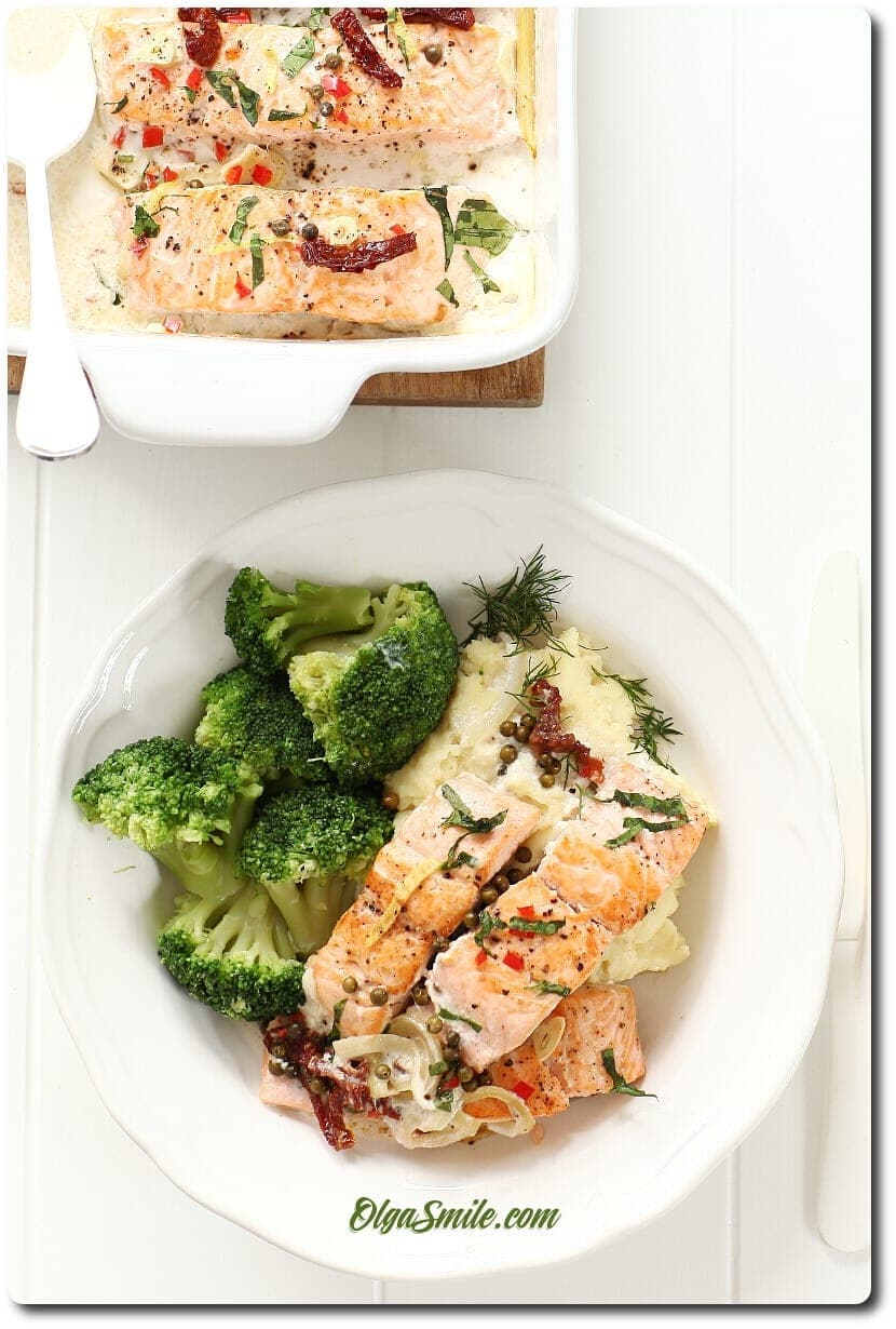 - Łosoś w kremowym sosie smakuje świetnie podany również z ryżem lub jak u mnie z ziemniakami puree, które cudownie wchłaniają cały sos śmietanowy, ten który powstał w czasie pieczenia ryby.