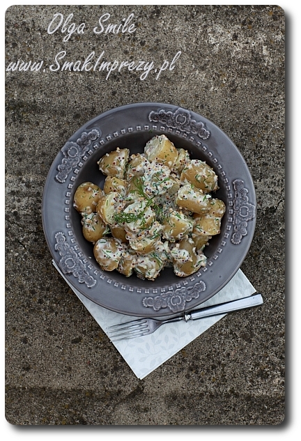 Kilka dni temu kupiłam pierwsze młode ziemniaki w tym roku. Pakowane na tackach po pół kilograma, czekały na dolnej półce lodówki na swoją wielką chwilę. Nastała ona wczoraj, kiedy to postanowiłam przygotować sałatkę ziemniaczaną z dodatkiem musztardy, czosnku, koperku i śmietany. Takie proste i aromatyczne danie podane w słoneczny dzień smakowało wprost wyśmienicie.