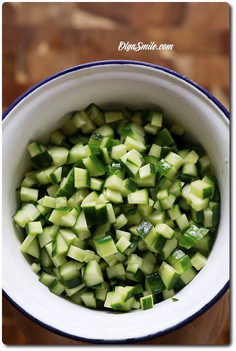 Miałam też bardzo ładny pęczek rzodkiewki a właściwie nawet trzy. Jeden zjadłam już po drodze do domu, więc został tylko dwa do wykorzystania. I dobrze się złożyło, bo pokrojony w drobną kostkę podobnie jako ogórki bardzo fajnie wkomponowały się surówką z kapusty młodej białej. Oczywiście ogórka możecie pokroić w kostkę, tak jak to ja zrobiłam. Możecie także pokroić go w plasterki w półplasterki albo w całkiem duże kawałki, takie wymagające większej ilości gryzienia. Podobnie sprawa ma się z rzodkiewką.