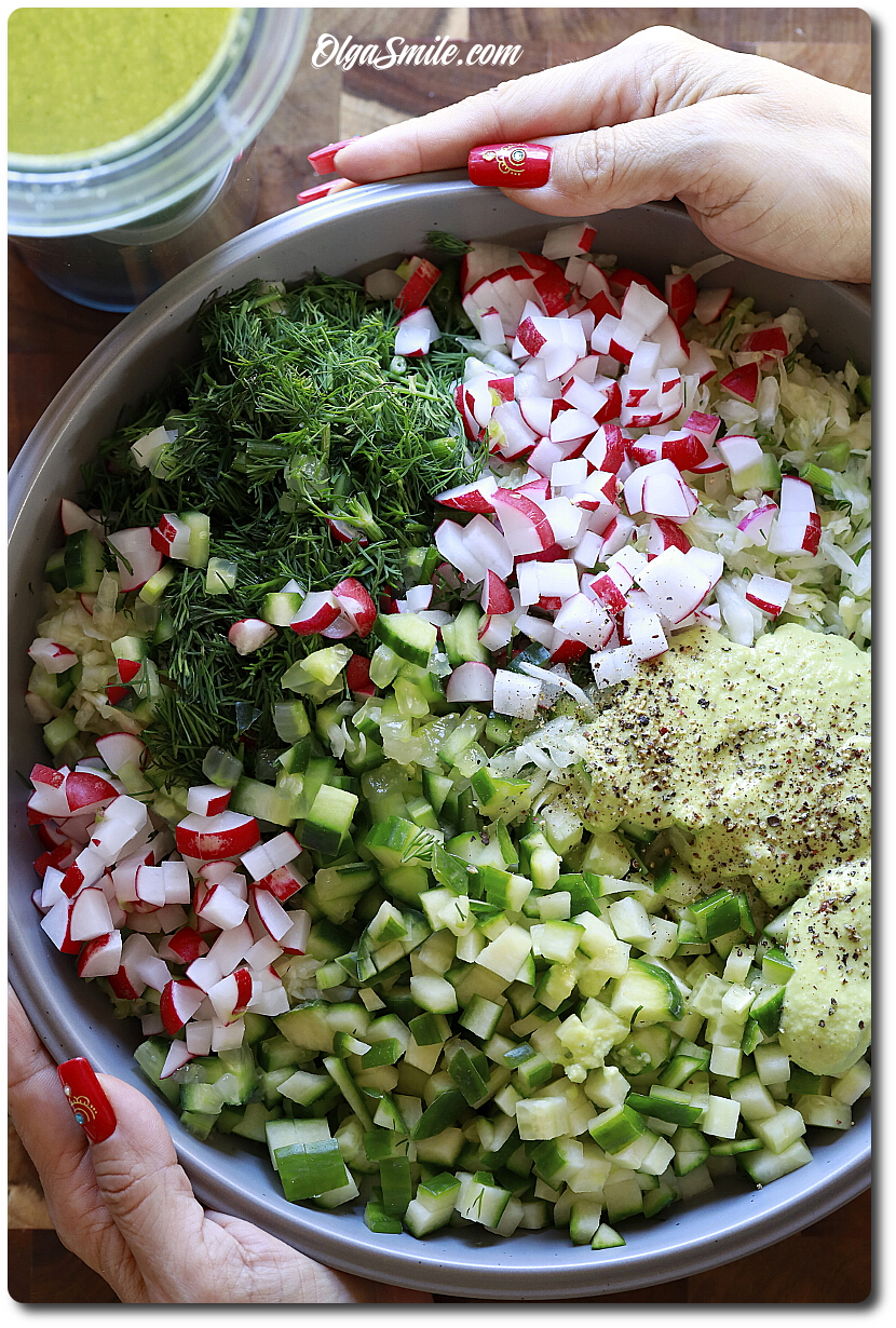 W jednej misce wylądowała poszatkowana kapusta, pokrojone w kostkę ogórki, równie drobno pokrojony czerwone rzodkiewki, poszatkowany koperek. Oraz cały kieliszek 200 mililitrowy sosu z awokado, orzechów i soku z cytryny. Wszystko wymieszałam bardzo dokładnie i doszłam do wniosku, że jeszcze mi czegoś brakuje i tym czymś była tłusta śmietana.