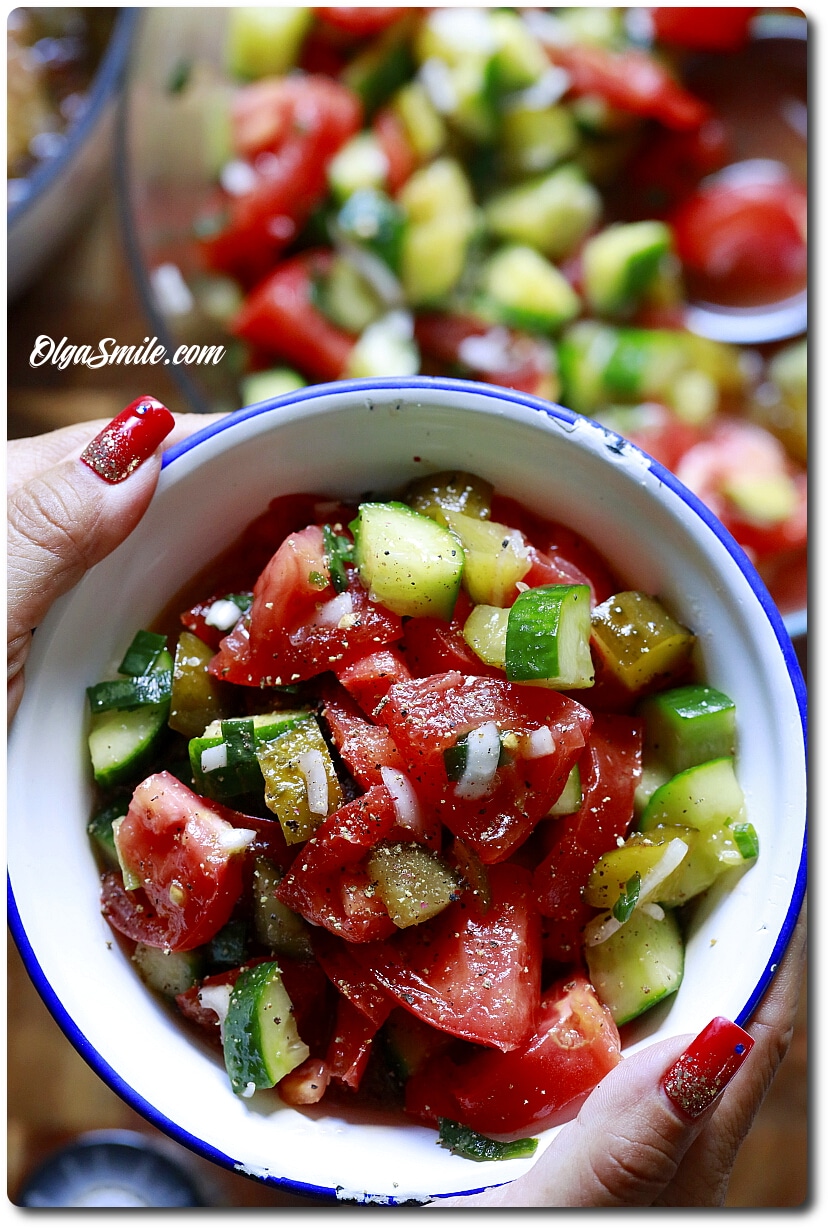 - Taka surówka z pomidorów, ogórków i cebuli najlepsza jest latem gdy warzywa są pełne smaku, aromatyczne i gaszą pragnienie.