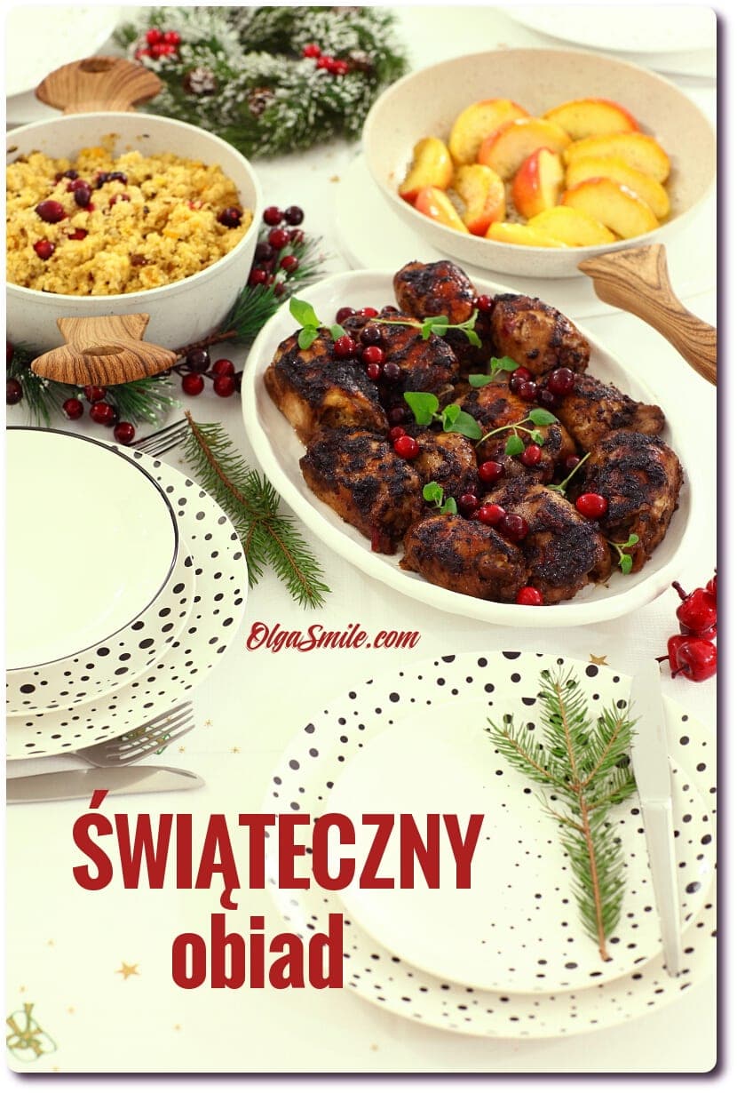 Dzisiaj mam dla was świąteczny obiad w całej okazałości. Ponieważ świąteczny obiad dla każdego znaczy coś innego i pojawiają się zupełnie inne pomysły na dania, to dzisiaj moje propozycje! Ponieważ święta za pasem i doskonale wiem, że planujecie dania aby zaskoczyć gości to mam dla was kilka fajnych propozycji. Wiadomo, że w Wigilię będą ryby w najróżniejszej postaci, ale pierwszy i drugi dzień Świąt Bożego Narodzenia to już zupełnie inne dania. Ze swojej strony polecam do przygotowania kurczaka z żurawiną i octem balsamicznym, który nie tylko pięknie wygląda, ale również dobrze smakuje. Lekką i puszystą kaszę kuskus z bakaliami, suszonymi owocami i orzechami, skąpanymi w skórce pomarańczowej. Do tego dla tych co lubią bardziej tradycyjne dania, kaczkę z pomarańczami i żurawiną, a także jabłka smażone, które podkreślą typowo świąteczny nastrój. Jeśli lubicie przygotujcie do tego zestawu jeszcze ziemniaki, kluski śląskie lub kopytka, bo w końcu to jedne z najlepszych naszych polskich tradycyjnych klusek. Co roku się śmieję, że u nas Święta są wcześniej, gotując dla swoich czytelników dania obiadowe na Wigilię i całe Święta, muszę to zrobić wcześniej, wypróbować, dopracować, jeszcze sprawdzić raz i dopiero opublikować. A Ty, jakie danie świąteczne lubisz lub wspominasz, co jadało się u ciebie na świąteczny obiad?