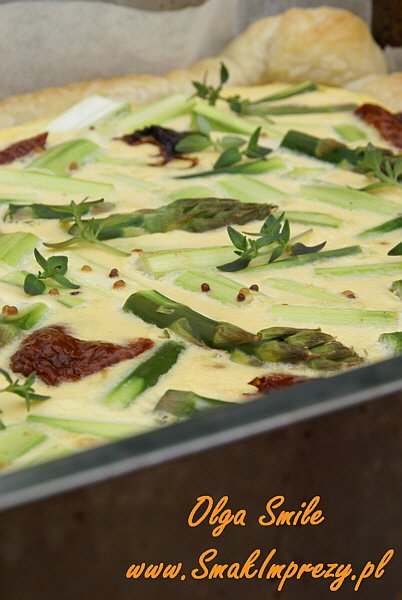 Jestem wielbicielką tart i quichów czyli naszych rodzimych kiszów. Są piękne, łatwe do przygotowania, sycące i różnorodne. Ich wygląd i smak zależy tylko i wyłącznie od naszych możliwości, inwencji i upodobań kulinarnych. Ja zawsze preferuję nowalijki i produkty, które aktualnie są dostępne w sprzedaży. W związku z tym, że ostatnio przedstawiam przepisy na dania ze szparagami, oczywiście w moim repertuarze tart warzywnych nie mogło zabraknąć tarty szparagowej. Do jej przygotowania użyłam białych i zielonych szparagów. Udało mi się kupić świeże i jędrne wiązki obu gatunków, więc nie mogłam się oprzeć. Oba są smaczne, oba piękne, i oba do dostania u nas w sezonie bez większego wysiłku. Co więcej, nie wiem, czy wiecie ale są to naszej rodzimej produkcji szparagi, ha … a ja zawsze myślałam, że są importowane. Teraz tym bardziej będę ich używać w kuchni z wielkim zadowoleniem.Tarta ta jest dość delikatna w smaku, więc zaostrzyłam ja musztardą ziarnistą zwaną powszechnie francuską, co dało lepszy smak, ciekawą fakturę i fantastyczny efekt pękających kuleczek w ustach. To lubię! A właśnie, oczywiście ciasto francuskie stanowi spód tarty, po co się przemęczać, pięknie i smacznie, nie musi przecież oznaczać wielce pracochłonne. |