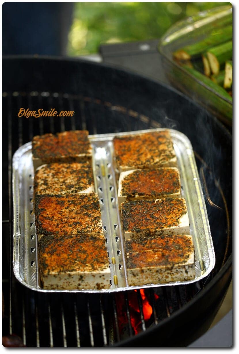 - Nacieram nią dokładanie plastry tofu grilluję na natłuszczonych kratkach grillowych lub drobniejszej siatce. Po kilku minutach przewracam na druga stronę i grilluję dalej.