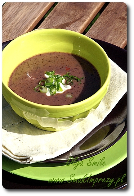 To jedna z propozycji, które przywodzi mi na myśl kuchnię meksykańską. Zapewne za sprawą czerwonej lub czarnej fasoli, która osobiście gości w mojej kuchni niezwykle rzadko. Nawet nie potrafię sprecyzować, dlaczego tak jest, po prostu najczęściej wykorzystuję białą lub kolorową fasolę do przygotowywania sycących i rozgrzewających dań jednogarnkowych sprawdzających się idealnych na zimowe lub jesienne wieczory. Takie zupy podaję również latem, jeżeli maja stanowić samodzielny posiłek, wtedy z dodatkiem wielkiej pacyny kwaśnej śmietany lub bułki wspaniale sycą wprawiając wszystkich biesiadników w uczucie błogiego rozleniwienia. Zupa fasolowa jak wspominałam, jest dla mnie odzwierciedleniem kuchni meksykańskiej, kolarzy mi się ze smakiem tortilli z fasolą, sosem mole, fasolą z mięsem, kotletami z fasolą, generalnie kuchnią sycącą, smaczną i dość kaloryczną. Nie mam zamiaru stresować się w tym wypadku kaloriami, czasami szybkość dania stanowi o jego atrakcyjności i o tym, że właśnie ono najbardziej pasuje mi w danej chwili. Jeżeli chcę przygotować zupę, bo za kilka minut mają zjawić się goście, wtedy bardzo przydatna okazuje się fasola w puszce. Im ciemniejsza, tym lepsza, zwłaszcza do tej propozycji, którą na stole połączyłam z czarnym chlebem. Pasuje bardzo i zdecydowanie świetnie smakuje z dodatkiem kwaśnej śmietany. Gęsta śmietana przełamuje typowy fasolowy smak, dodaje odrobinę kwaskowatego posmaku moje zupie, przy jednoczesnym skutecznym gaszeniu ostrości papryczki chili. Właśnie taka ciemna zupa fasolowa jest smaczną i szybką propozycją dania podawanego w trakcie spotkania z przyjaciółmi, gdy za oknem pada śnieg i na samą myśl spacerze cierpną mi dłonie.
